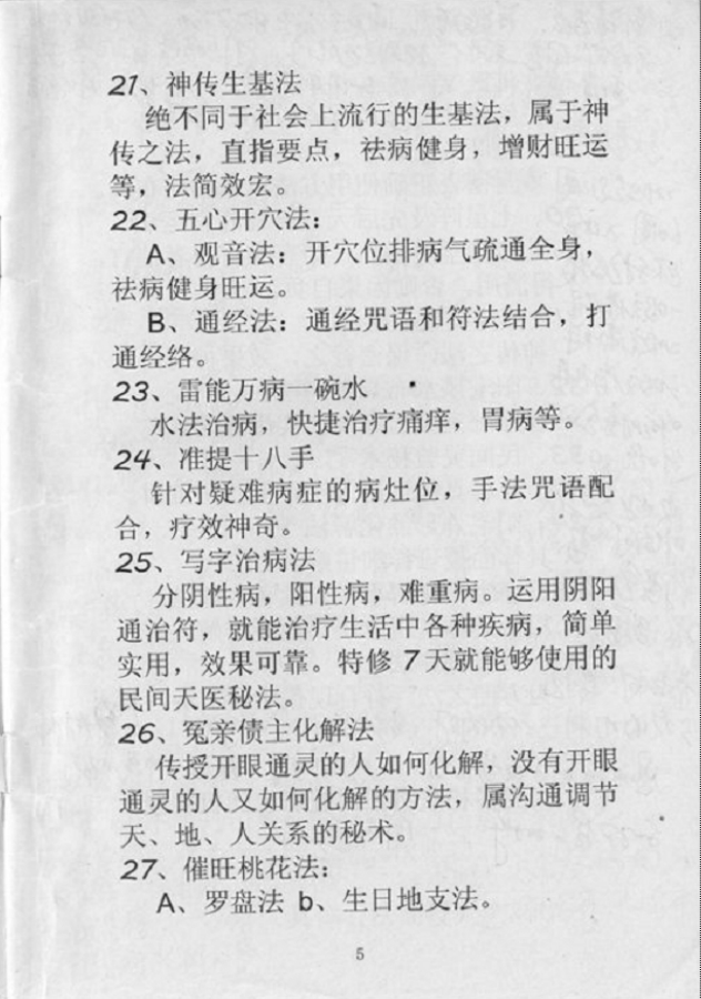22、五心开穴法:(1)观音法:开穴位排病气疏通全身,祛病健身旺运。(2)通经法:通经咒语和符法结合,打通经络。