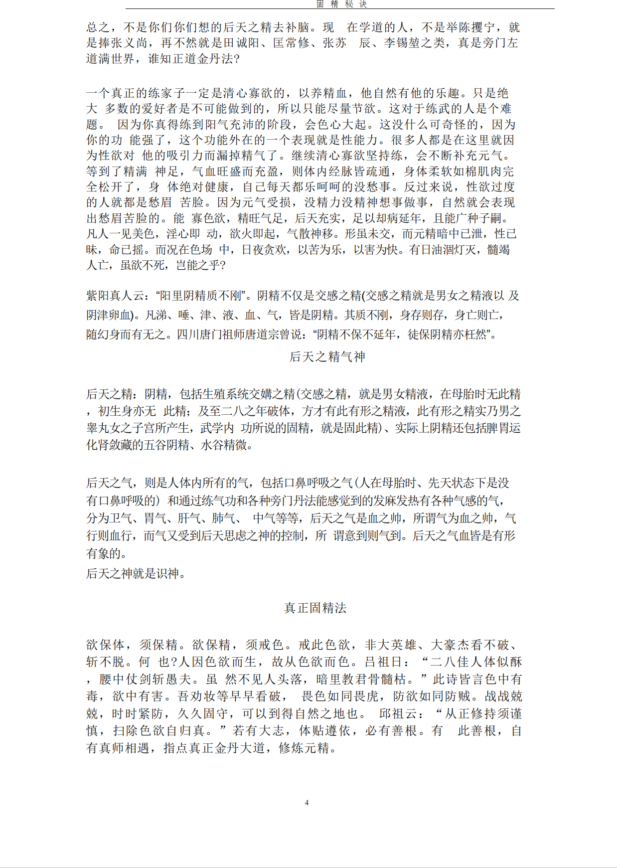 固精秘诀功法国学资料网独家整理36页电子版 2018-01-11 气功养生 本站独家整理清晰版,并补全了原锁阳口诀 “提缩谷道力适中后面缺少四句真诀!!公开内家真传的固精秘法!普通固精法效果非常小,许多人练功到关键时刻就走丹,导致修炼无法提高,甚至多年无法解决这个问题。止住滑泄,方可长寿。现在很多年轻人因邪淫致身体大亏,无数修道之人无法解决男女之漏的矛盾,甚至十多年无法完成筑基,这都是因为未得真传固精术! 资源下载下载价格280 术币VIP免费升级VIP立即购买 0