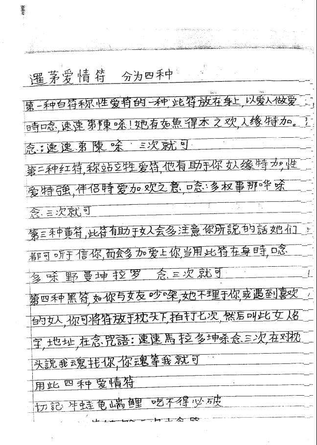 南洋降头术法本,很难得一见的法本,共有120页,居然后面还附有英文,还是中英文对照的。 所谓降头术,从步骤上看就在于“降”与“头”。“降”指施法的所用法术或药蛊手段;“头”指被施法的个体,并包含了对被施法个体的“个体联系把握”(如被施法者的生辰八字,五行命理,姓名,所在地点,常用物品,身体部分关联物如毛发指甲等)。降头术本质即是运用特制的蠹虫或蛊药做引子,使人无意间服下,对人体产生特殊药性或毒性从而达到害人或者控制一人的目的;或者运用灵界的力量如鬼魂,通过对个体被施法者的八字姓名及相关物品而构建信息,进而“模拟个体”,最后达到制服或者杀害被施法者的目的。 施术内容涉及鬼魂和巫术的范围,大致可分为“降术”与“蛊毒” 两个部分,一般称为“降头”。其实‘降头’二字是泰语发音(Gong-Tou),‘降’指的是种种施行的法术或蛊术;‘头’指的是受术的个体或是标的物,‘降头’翻译成中文即是向某人或某特定标的物施行法术的意思。 ![]() |