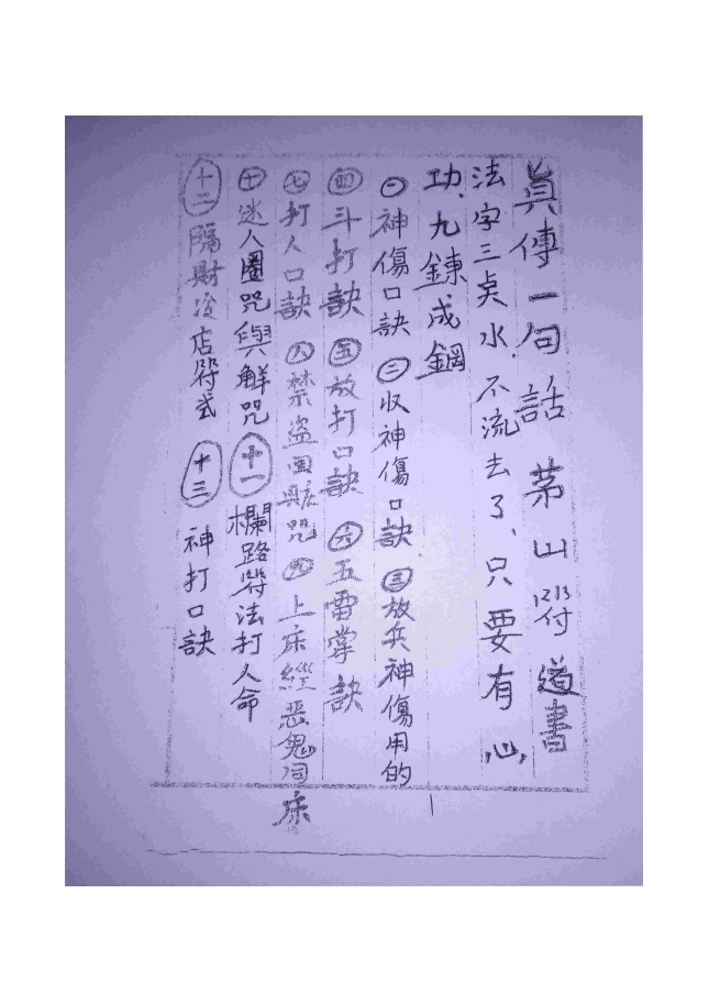 打人口诀。禁盗回赃咒。上床经恶鬼同床,迷人圈咒与解咒。拦路符法打人命,隔财冷店符式,神打口诀。