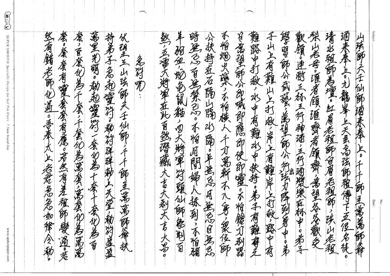 人亲教不亲,口教吐分明,若然不奉亲口教,六壬妙法一律使不灵。前传口教钱财奉足即使即灵。阳师亲度,阴师吐法。六壬仙法是个先得而后修的方便法门,经坛前师傅亲自过教,当即得法,且不用忌口,不惧任何血污之物,百无禁忌、千变万化、逢凶化吉、百打百胜、千邪弄不出,万邪弄不行!一人学法全家沾恩!