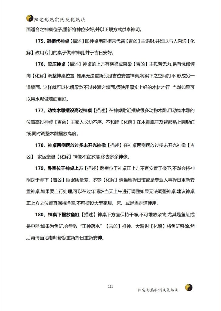 阳宅形煞实例及化煞法介绍了阳宅形煞的概念、分类及实例,并提供了相应的化煞方法。通过学习,可以了解阳宅风水的基本知识和实用技巧,提高居家环境的舒适度。### 知识点1:阳宅形煞的概念- 阳宅形煞是指住宅环境中因地形、建筑等原因形成的不良气场,可能对居住者的运势和健康产生负面影响。> 原文引用:“阳宅形煞,是指因地理环境、建筑物外形等原因,导致住宅内部气场不佳,影响居住者的运势和健康。”### 知识点2:阳宅形煞的分类- 阳宅形煞分为多种类型,如尖角煞、壁刀煞、反光煞、味煞等。每种形煞都有其特定的形成原因和化解方法。> 原文引用:“阳宅形煞种类繁多,如尖角煞、壁刀煞、反光煞、味煞等,每种形煞都有其独特的形成原因和化解之道。”### 知识点3:阳宅形煞的实例及化煞方法- 文中列举了多个阳宅形煞的实例,如壁刀煞可能导致家庭不和,反光煞可能影响视力等。针对每种形煞,都提供了相应的化煞方法,如摆放植物、设置屏风等。> 原文引用:“例如,壁刀煞可能导致家庭不和,化解方法是在壁刀所对的方位摆放大型绿植或设置屏风;反光煞可能影响视力,化解方法是在窗户上安装窗帘或百叶窗等。”### 知识点4:阳宅风水的重要性- 阳宅风水对于居住者的运势和健康具有重要影响。了解阳宅形煞及其化解方法,可以帮助改善居家环境,提升生活质量。