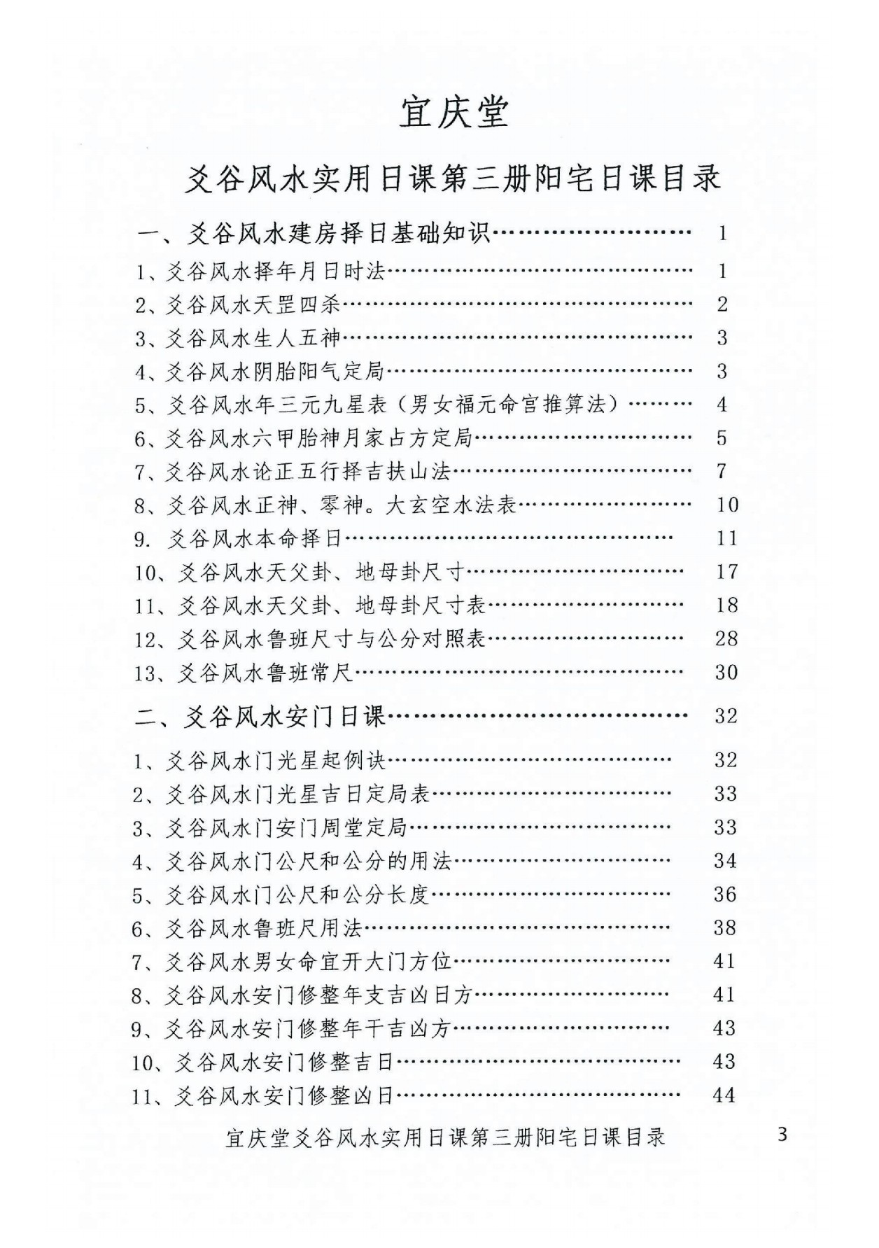 《第三册阳宅日课》是建房、动土、起基、上梁、放水、安门、门尺、鲁班尺转公分量吉度对照表、作灶、修宅、筑墙、作厕、房运、安办公桌、桥塔祠、安神、寺庙、香火、福元、修造等择日,建房高低对照表