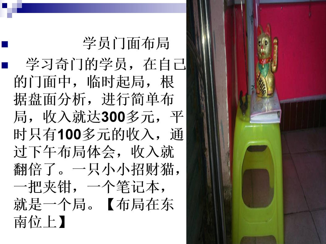 奇门财位能量布局高级研修班PPT256页电子版 2020-02-03 民间秘法 奇门核心高层的财富奇门极速转运布局秘法,简单易懂,无论男女老幼,有无易学基础均可学会,让您系统学到奇门中的核心知识,起局简易,不用死记硬背。布局灵活,布局后在该时辰会出现相应的人,或事物,下雨等现象。利用所布物品调整气场,配合方位时空能量来达到增加能量磁场的目的,从而增加财运的3至5倍。将是为企业界策划人士,管理总裁, 企业讲师,营销精英,金领,白领人士,及想从事商务行业等的朋友们提供发展自我,实现自我人生价值,放飞人生梦想的舞台。 资源下载下载价格280 术币VIP免费升级VIP立即购买 0