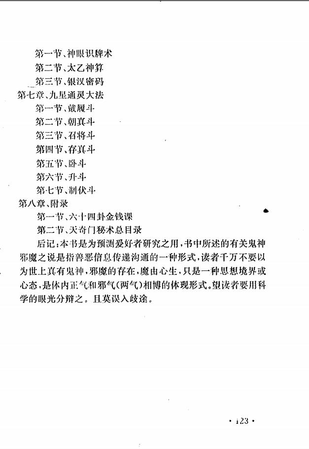 全书151页,天奇门信息预测概述、第一印象的准确性、胆大人艺高、综合信息预测术(字画、景物、风水相术等)、人体本能信息传导预测、遥测遥感,看光,闻声预测、园光术与扶乩、造梦预测术、九天幺女耳报法、通灵大法、掐指神通、铁算盘通灵法机传通