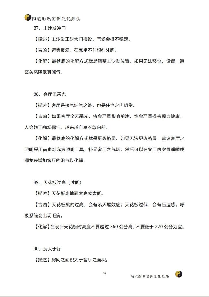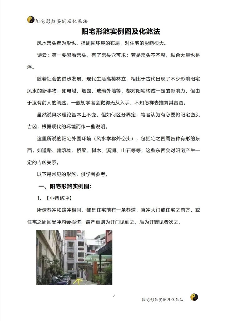 阳宅形煞实例及化煞法介绍了阳宅形煞的概念、分类及实例,并提供了相应的化煞方法。通过学习,可以了解阳宅风水的基本知识和实用技巧,提高居家环境的舒适度。### 知识点1:阳宅形煞的概念- 阳宅形煞是指住宅环境中因地形、建筑等原因形成的不良气场,可能对居住者的运势和健康产生负面影响。> 原文引用:“阳宅形煞,是指因地理环境、建筑物外形等原因,导致住宅内部气场不佳,影响居住者的运势和健康。”### 知识点2:阳宅形煞的分类- 阳宅形煞分为多种类型,如尖角煞、壁刀煞、反光煞、味煞等。每种形煞都有其特定的形成原因和化解方法。> 原文引用:“阳宅形煞种类繁多,如尖角煞、壁刀煞、反光煞、味煞等,每种形煞都有其独特的形成原因和化解之道。”### 知识点3:阳宅形煞的实例及化煞方法- 文中列举了多个阳宅形煞的实例,如壁刀煞可能导致家庭不和,反光煞可能影响视力等。针对每种形煞,都提供了相应的化煞方法,如摆放植物、设置屏风等。> 原文引用:“例如,壁刀煞可能导致家庭不和,化解方法是在壁刀所对的方位摆放大型绿植或设置屏风;反光煞可能影响视力,化解方法是在窗户上安装窗帘或百叶窗等。”### 知识点4:阳宅风水的重要性- 阳宅风水对于居住者的运势和健康具有重要影响。了解阳宅形煞及其化解方法,可以帮助改善居家环境,提升生活质量。