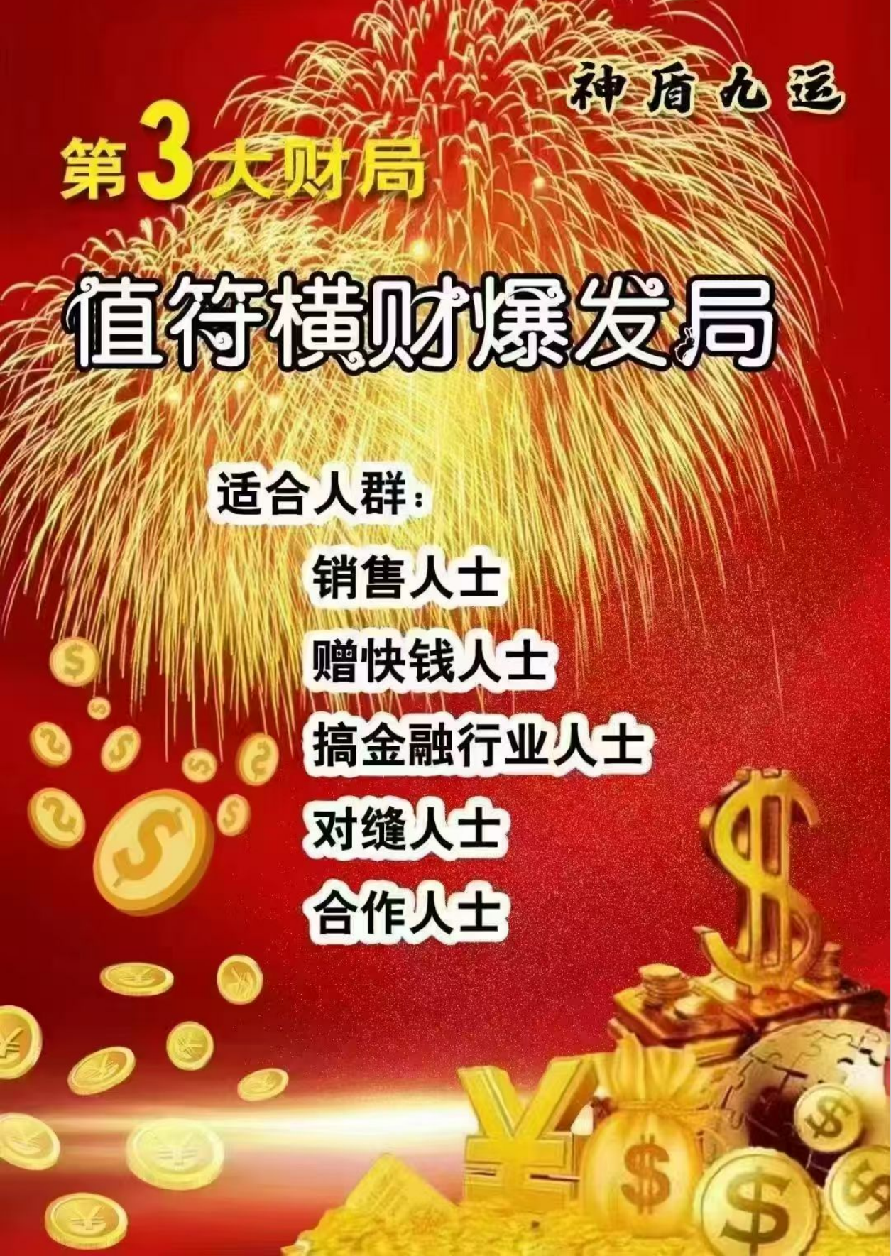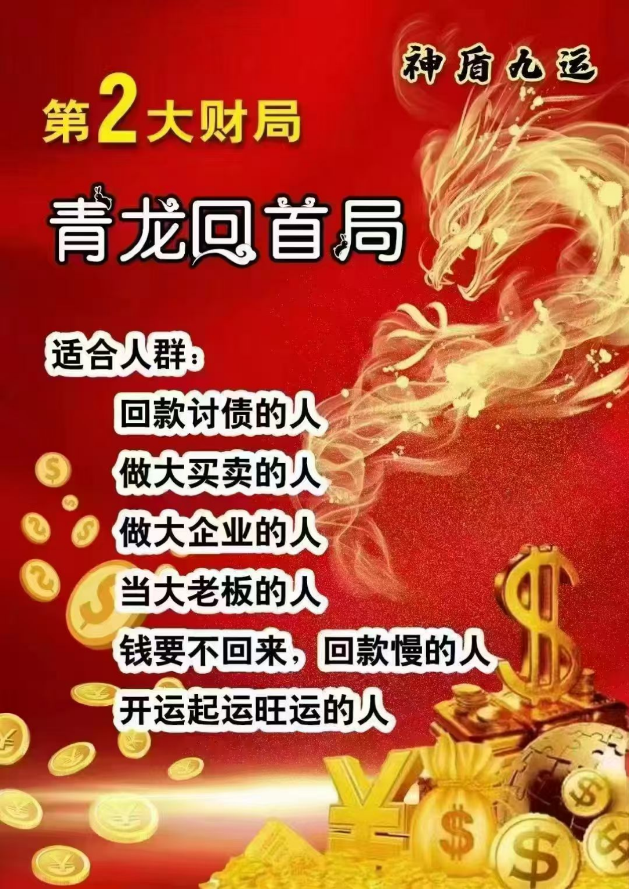适合:回款讨债、做大买卖、大老板、钱要不回来、开运起运旺运滴人