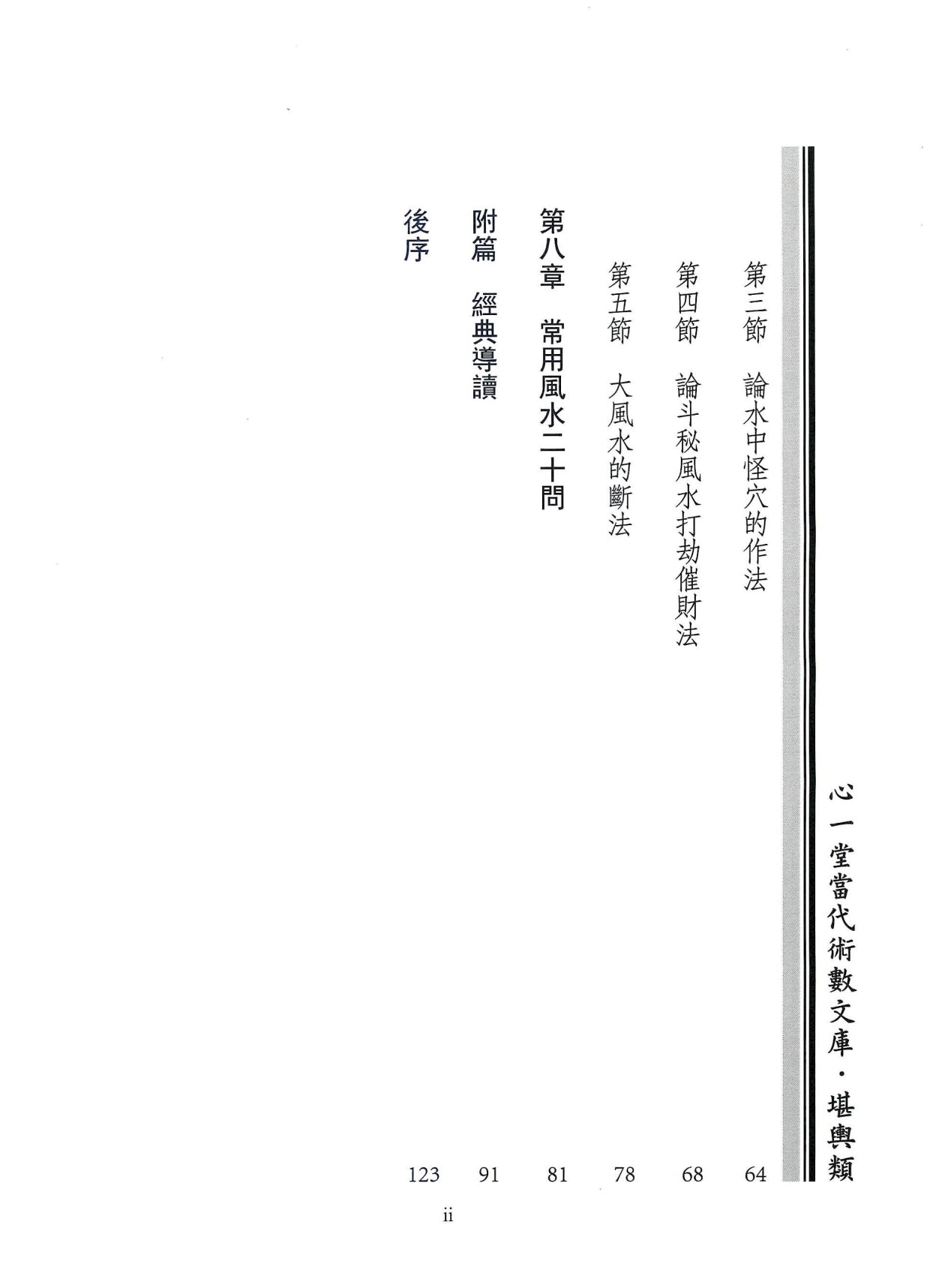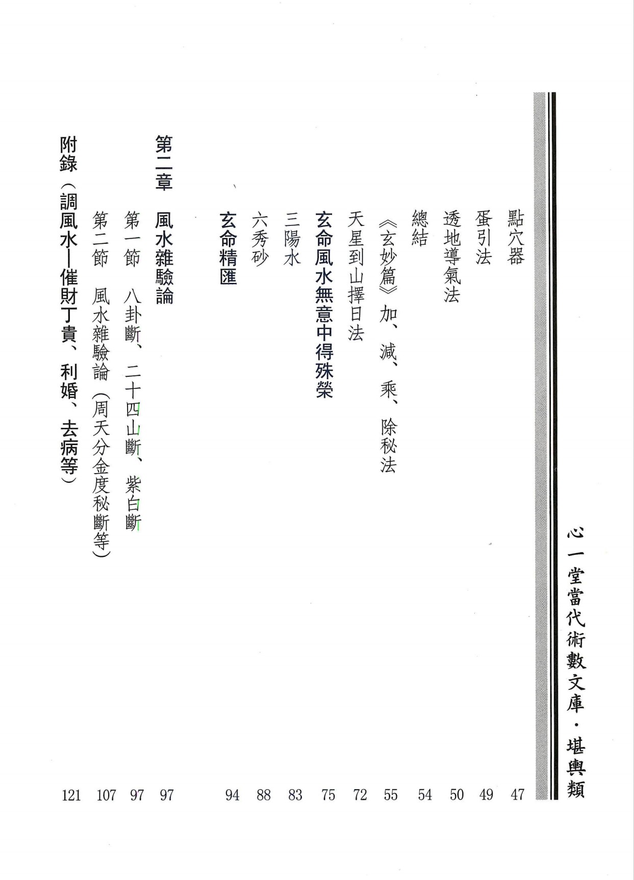 内容有:基础篇,玄空斗秘篇,玄关地命篇,秘诀篇,杨公镇山诀,断验及调风水 些子诀,两元挨星,择吉,地命法,地运法,流年爻变法,地眼气法,测外应法,论气线穴法,先后天秘断,六十甲子分金法,三卦之用,大风水的断法,四大水局,财丁和局等